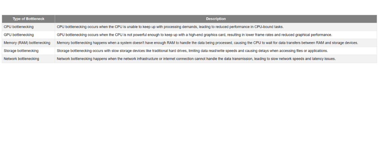 While CPU bottlenecking is one common bottleneck, there are other types of bottlenecks that can impact system performance: