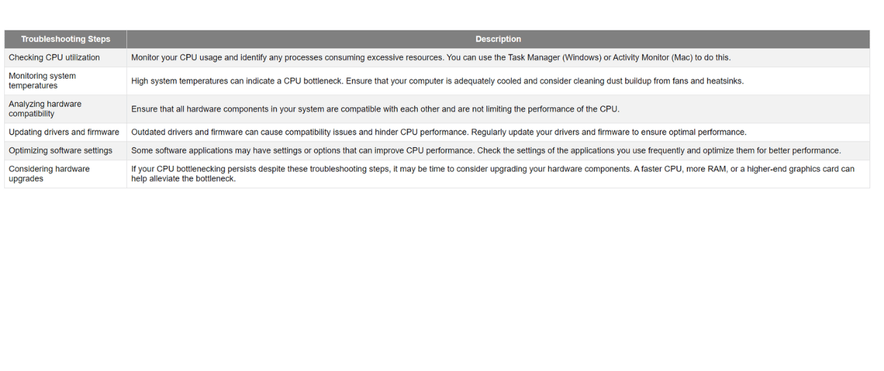Once you have identified CPU bottlenecking, there are several troubleshooting steps you can take to alleviate the issue: