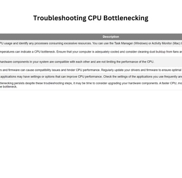 CPU bottlenecking occurs when the CPU's performance is limited by other components in the system. It can be caused by factors such as outdated hardware, workload imbalances, or compatibility issues. Detecting and troubleshooting CPU bottlenecking involves identifying signs and symptoms, utilizing benchmarking tools, and taking steps such as monitoring CPU utilization, optimizing software settings, and considering hardware upgrades. Preventing CPU bottlenecking involves choosing the right CPU, balancing components, and regular maintenance. Overcoming CPU bottlenecking brings benefits such as improved system responsiveness, higher frame rates in games, faster data processing, and enhanced productivity. By understanding and addressing CPU bottlenecking, you can optimize the performance of your computer system.
